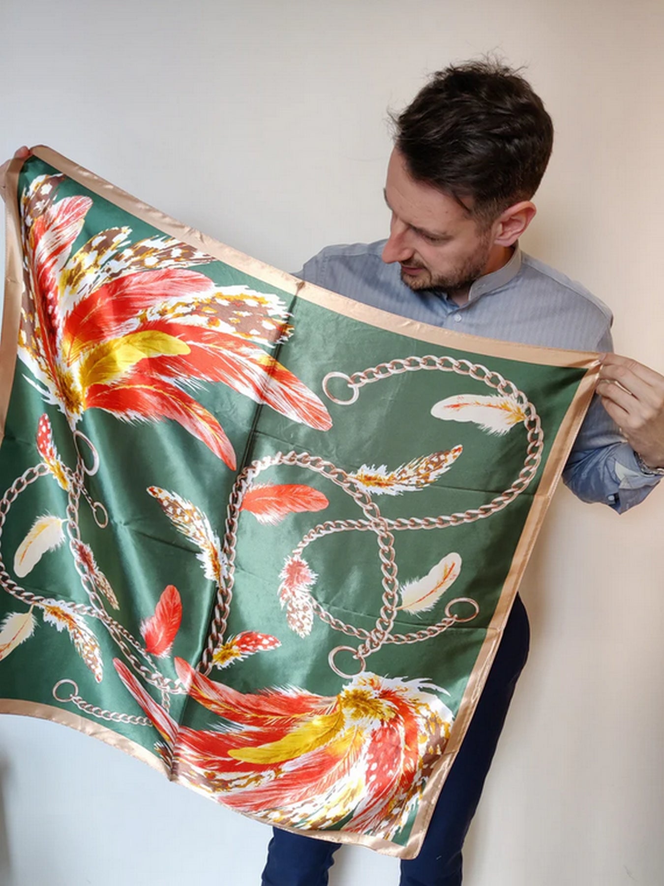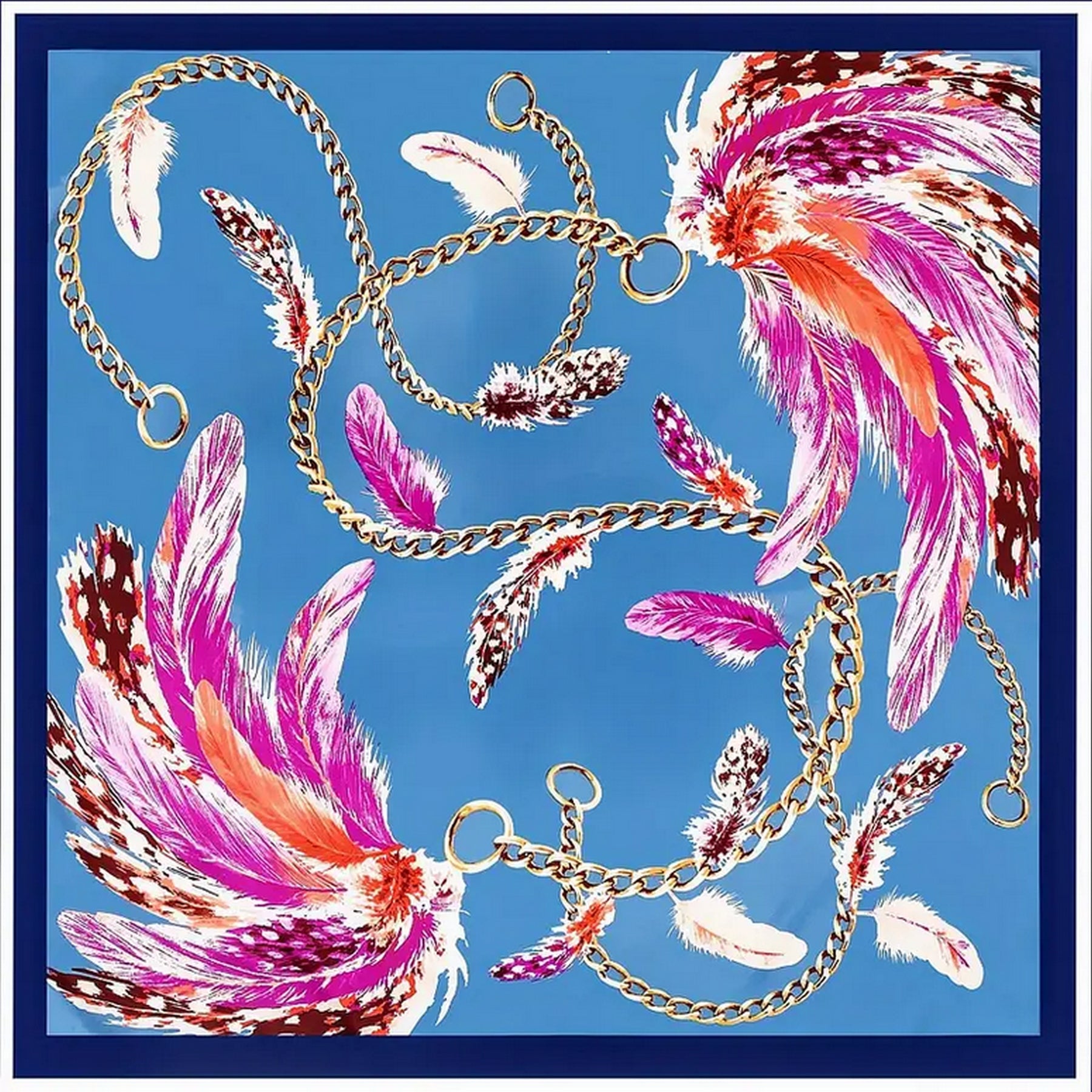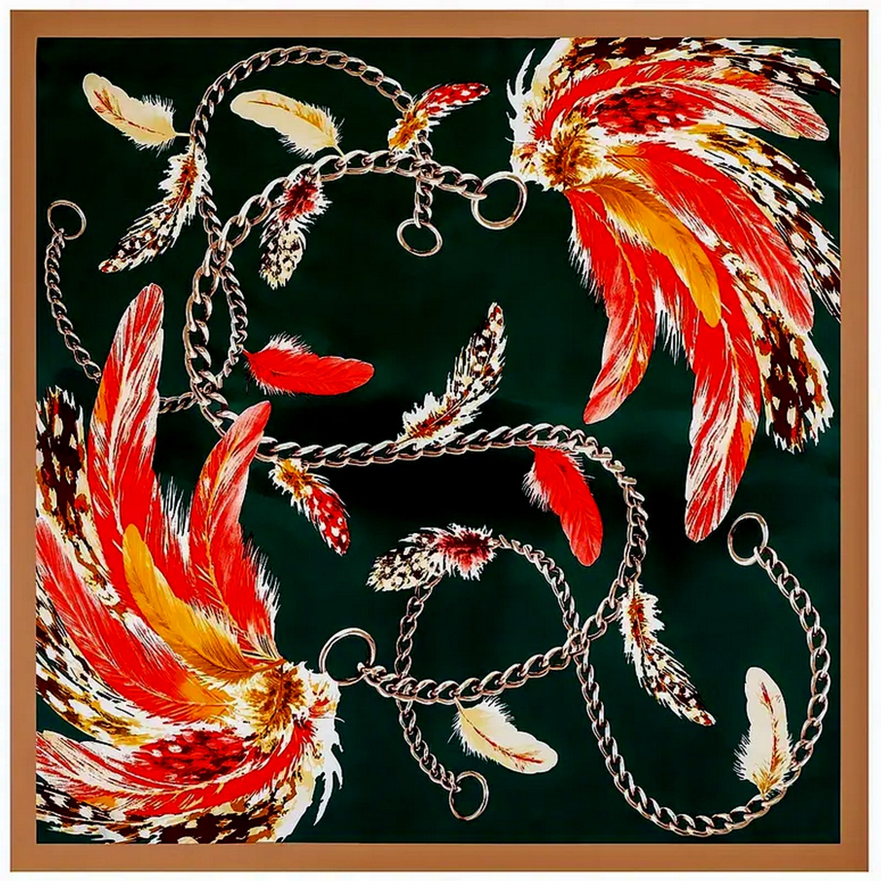 Scarf Shack Women’s Silk Feel Square Hair Neck Scarf Sleeping Headscarf, Feather and Chains Print Fashion Bandana