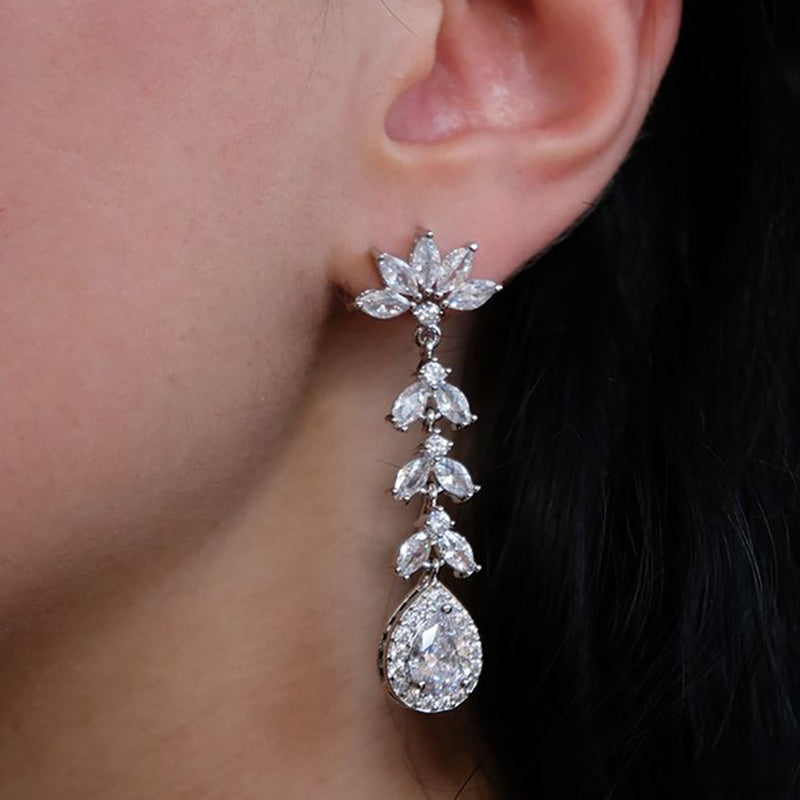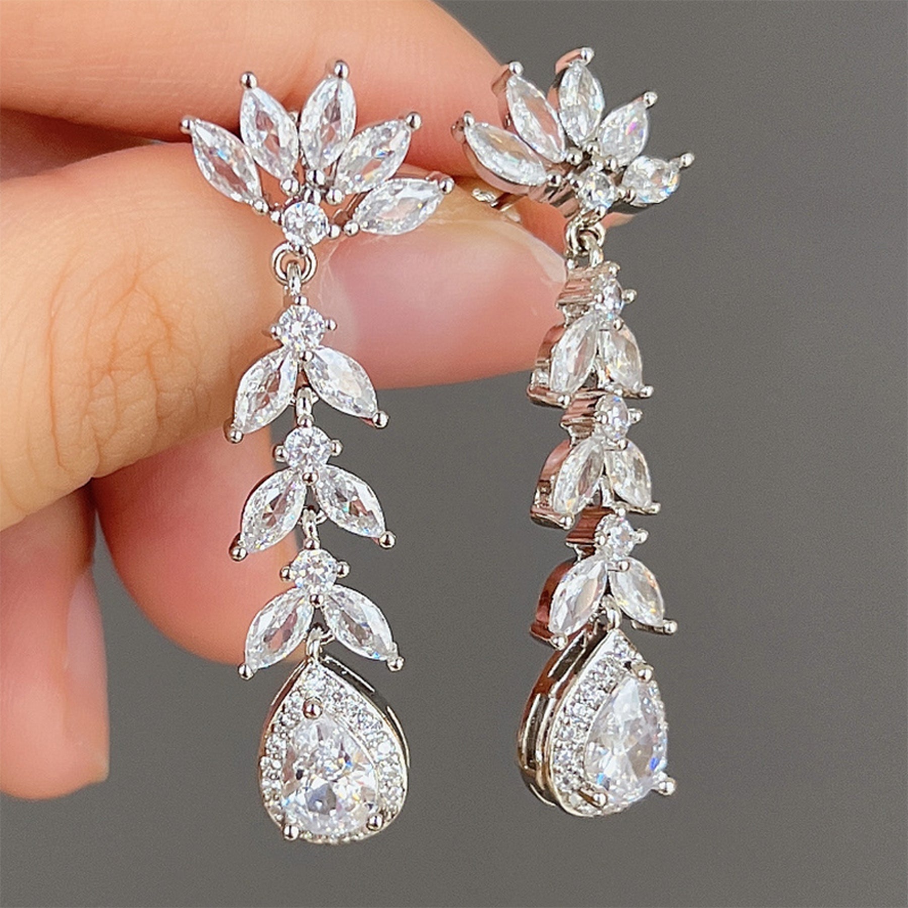 Elegant bridal earrings made of brass with silver plating, featuring marquise cut zircon stones in a romantic and trendy design. Perfect for anniversaries and weddings, these drop earrings are crafted using micro-insert technology for a luxurious finish.